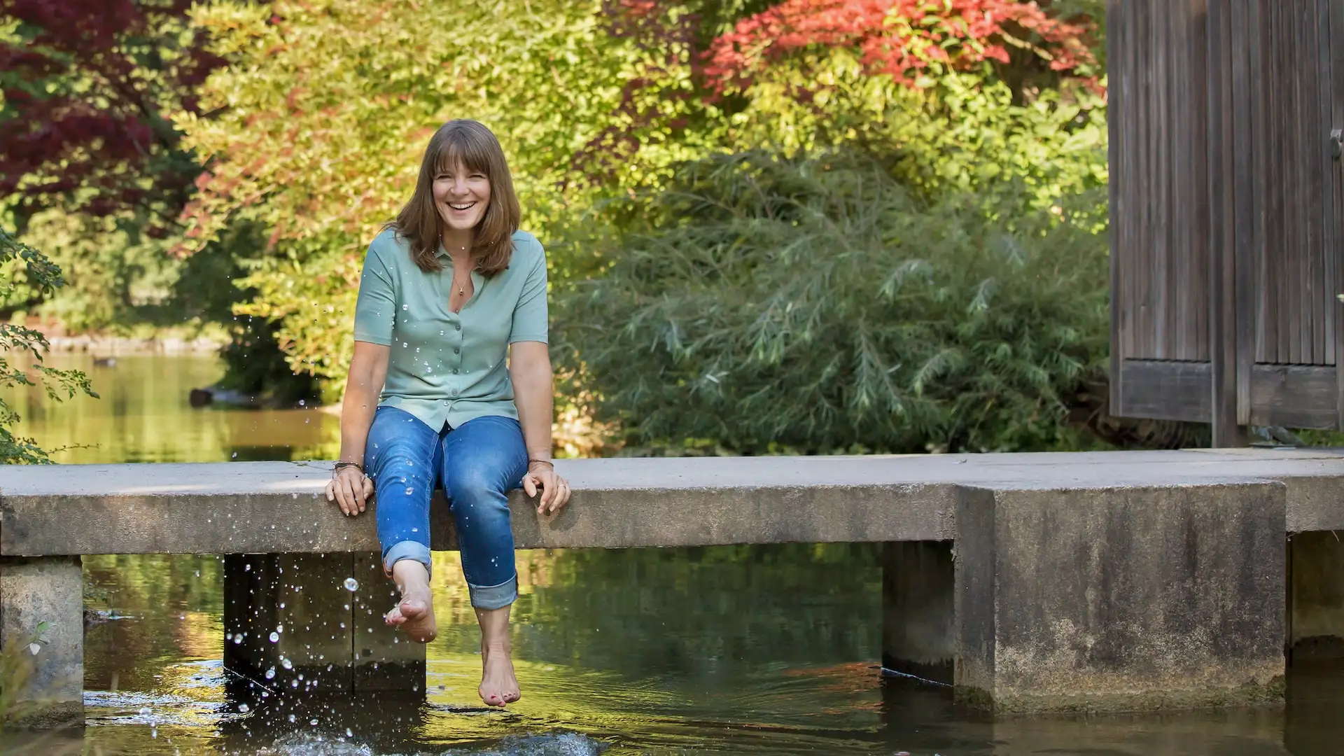 Silke mit Füßen im Wasser auf der Brücke